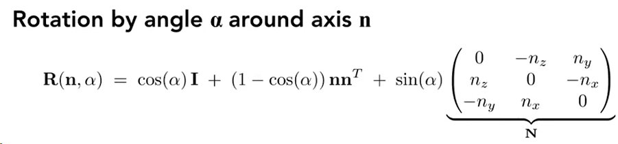 复杂旋转可以拆分为绕x、y、z轴的旋转(但是课程中没有说明旋转的顺序问题,也没有说明旋转时旋转轴是否要跟着转)绕任意轴的旋转可以通过Rodirigues公式转换为矩阵的形式。这里默认旋转轴是过原点的(不然光用一个向量是无法定义旋转轴的)。