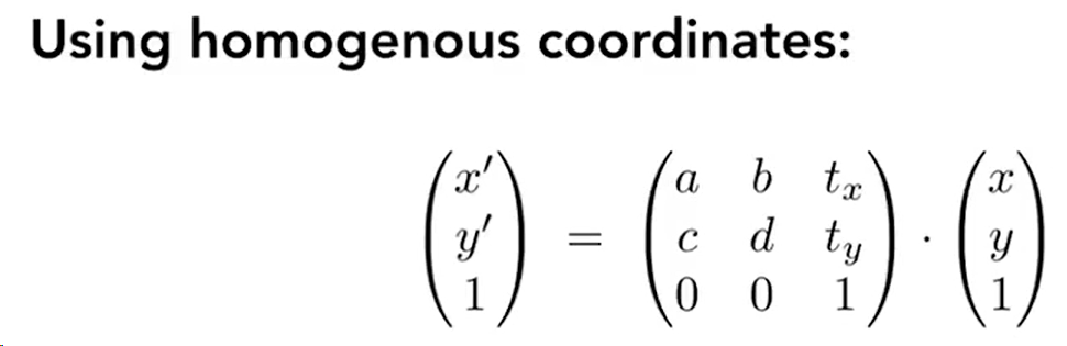 为了方便,用齐次坐标矩阵表示仿射变换,二者的效果是一样的。齐次坐标矩阵拥有比较固定的格式,最后一行是001(二维的情况)。相应的,被变换的对象向量或者点也要增加一维。