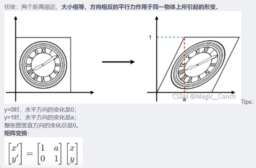 常见的变换有线性变换、非线性变换两种。其中线性变换包括旋转、缩放、切变,非线性变换包括平移。
