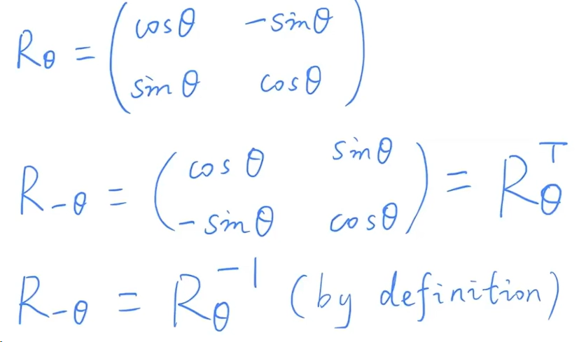 注意:旋转矩阵是正交矩阵,正交矩阵的逆等于它的转置。二维空间的证明如下: