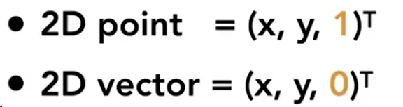 使用齐次坐标进行变换时,对点和向量有不同的表示方法,一般来说,为点加上的常数是1,因为点是可以平移的,而为向量加上的常数是0,向量是不可以平移的。