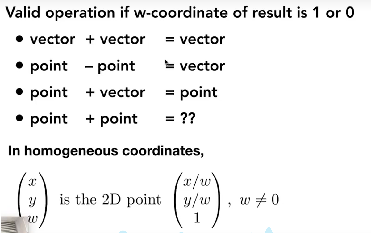 特别的,当两个点相加时,齐次坐标的w分量会大于1,此时规定w分量大于1的时候,该坐标等价于所有维度同时除以w分量的值。也就是说,点与点的和的几何含义是两点的中点。