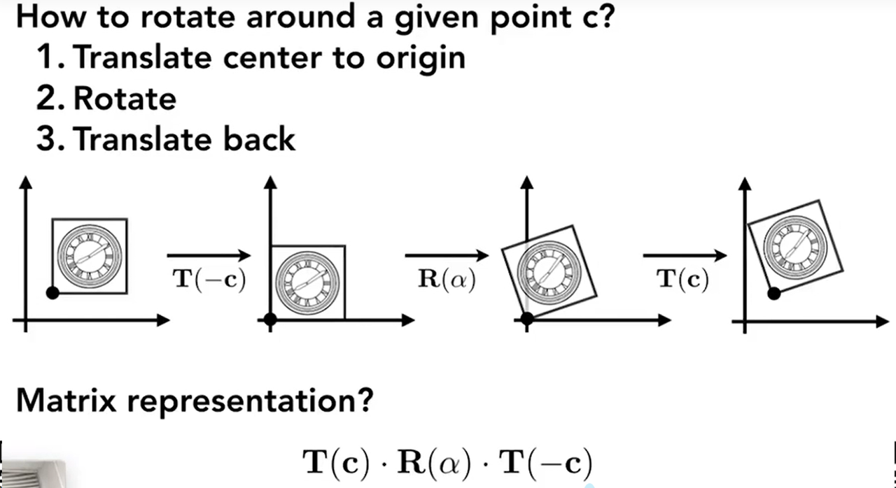 多种变换可以组合,数学上的计算是通过矩阵左乘的方式。一般来说,是先旋转和缩放,后平移,这是一种约定俗成,因为以原点为中心进行旋转是比较方便的。如果遇到了不以原点为中心进行旋转的情况,也可以先平移回原点,旋转后再平移回去,如图所示。
