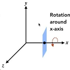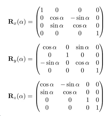 最普通的情况是绕x轴、y轴和z轴的旋转,他们对应的齐次坐标变换矩阵如下,注意中间沿y轴旋转的矩阵是反的,这是在三维的右手坐标系下坐标轴的顺序决定的。可以通过Z × X = Y看出,在XZ平面上,α角是与z轴正方向的逆时针夹角,而非x轴的,因此在应用时要对原本的二维矩阵进转置。